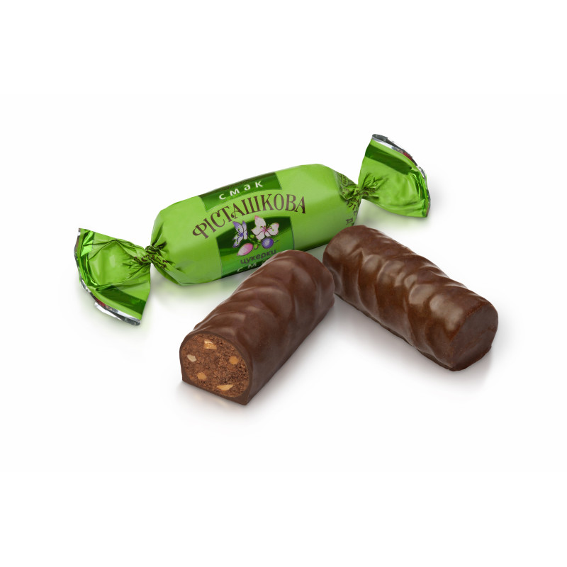 Глазуровані цукерки типу праліне зі смаком фісташки з додаванням подрібненого смаженого горіха.