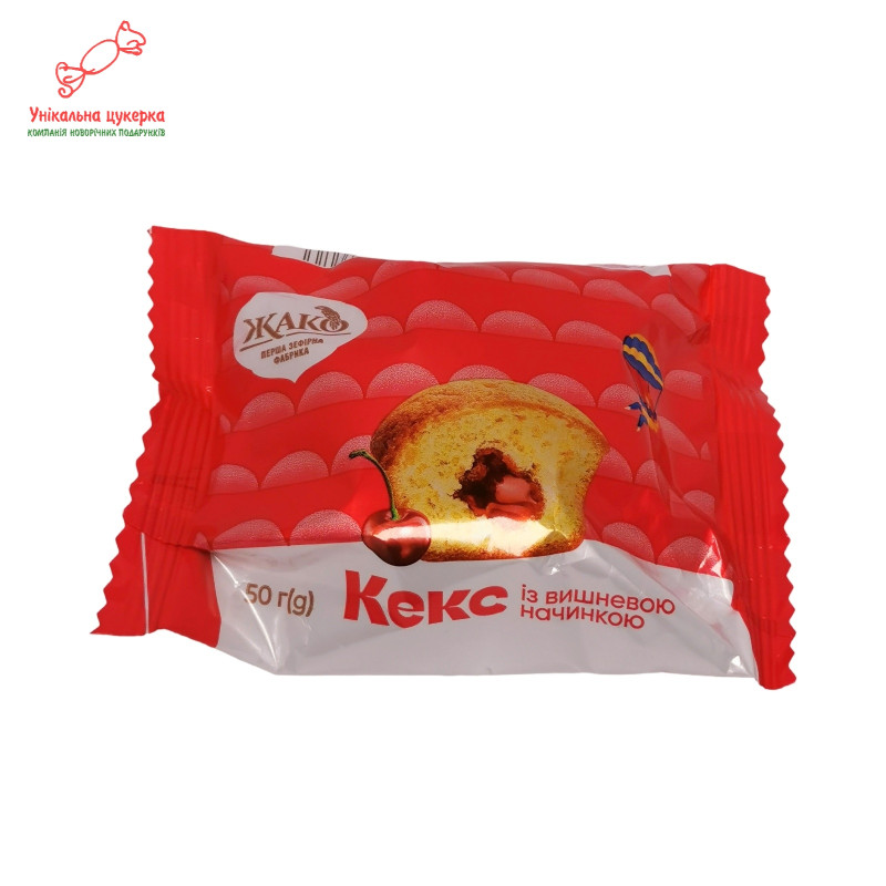 Кекс з вишневою начинкою виготовлений зі здобного тіста. У процесі приготування використовується борошно пшеничне вищого ґатунку, цукрова пудра, маргарин, яєчний білок, вишневе пюре, патока та інші інгредієнти.