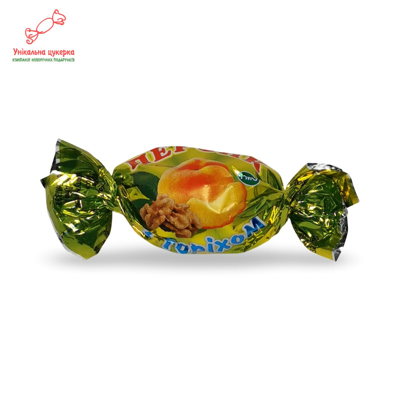 Сушений персик з грецьким горіхом в кондитерській глазурі.