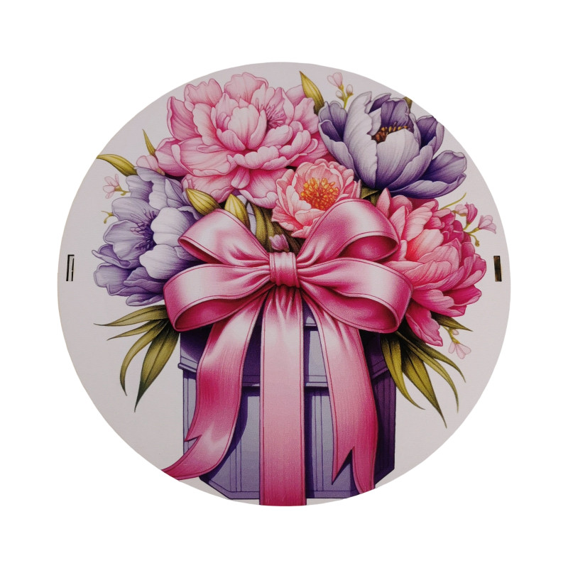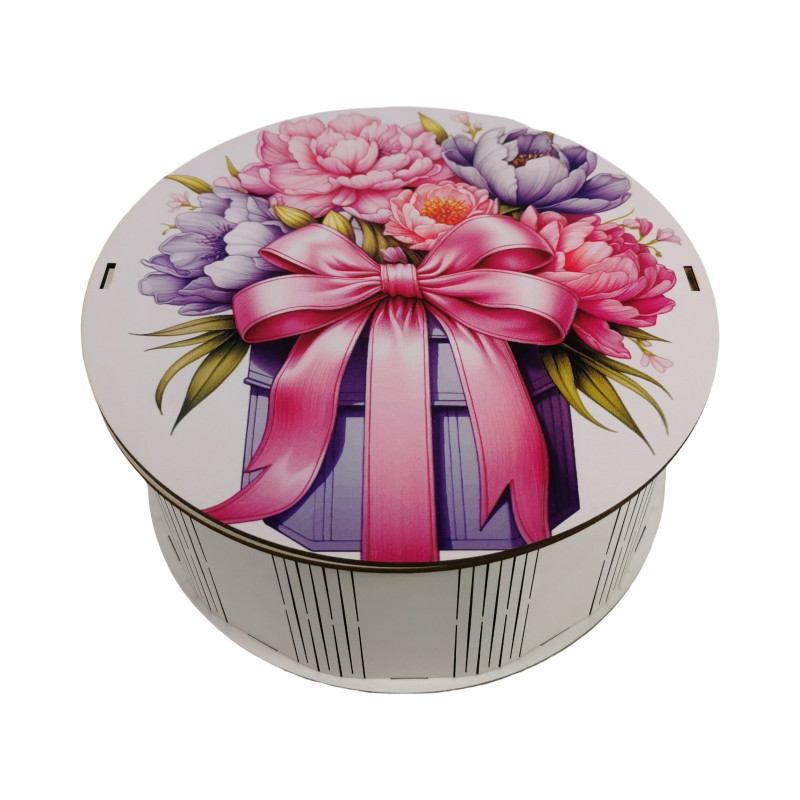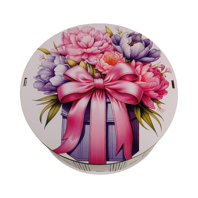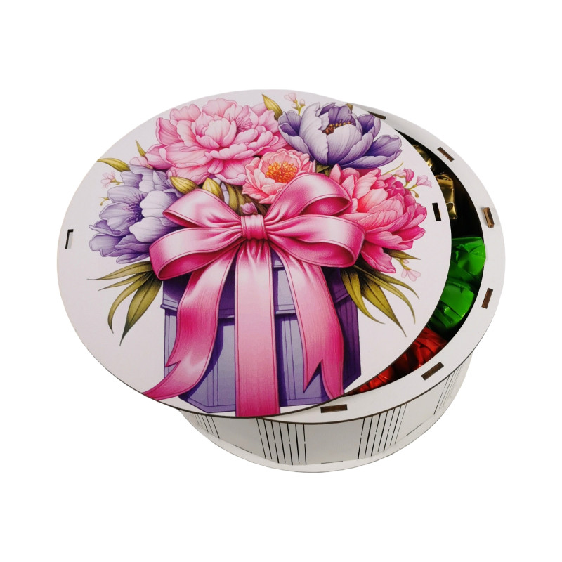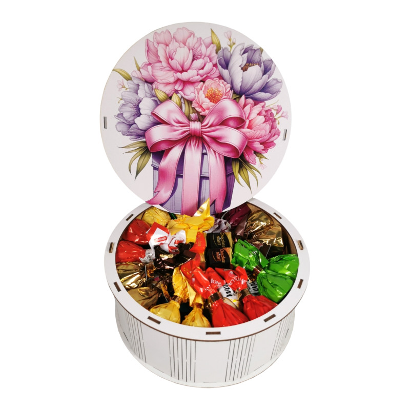 "Букет піонів" Дерев'яний бокс з солодощами №101/65, 1 кг, (21х21х9см)