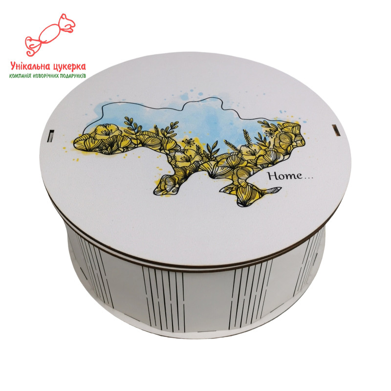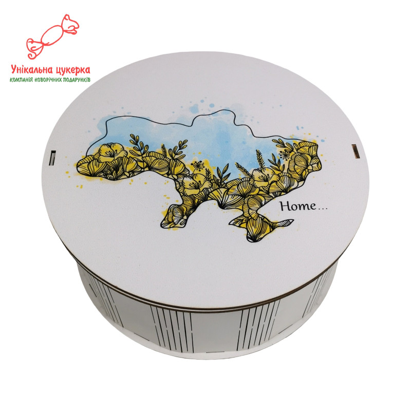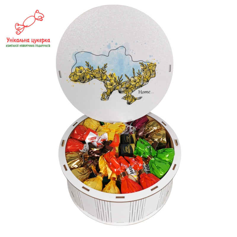Стане чудовим презентом з України. Красива якісна дерев'яна упаковка з наповненням із найсвіжіших цукерок відомих українських виробників. На коробці - карта України.