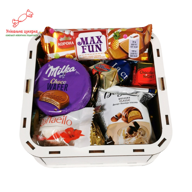 У випадку відсутності певної цукерки чи упаковки у виробника, у зв'язку з ситуацією в Україні, цукерка/упаковка буде замінена на рівноцінну по ціні, якості.
