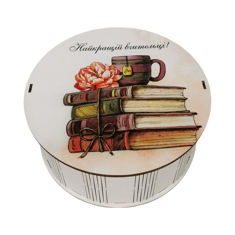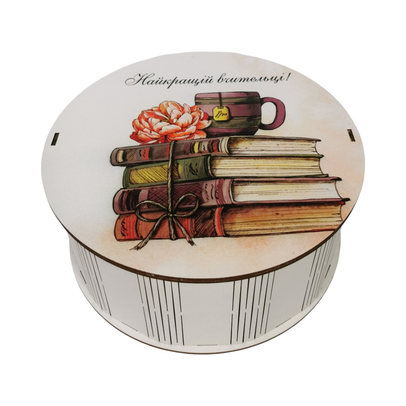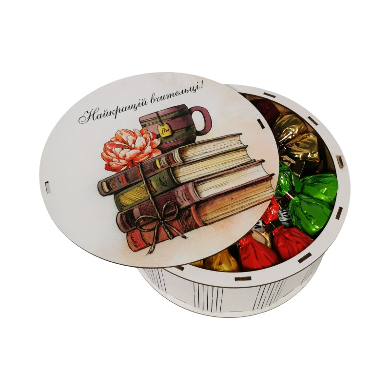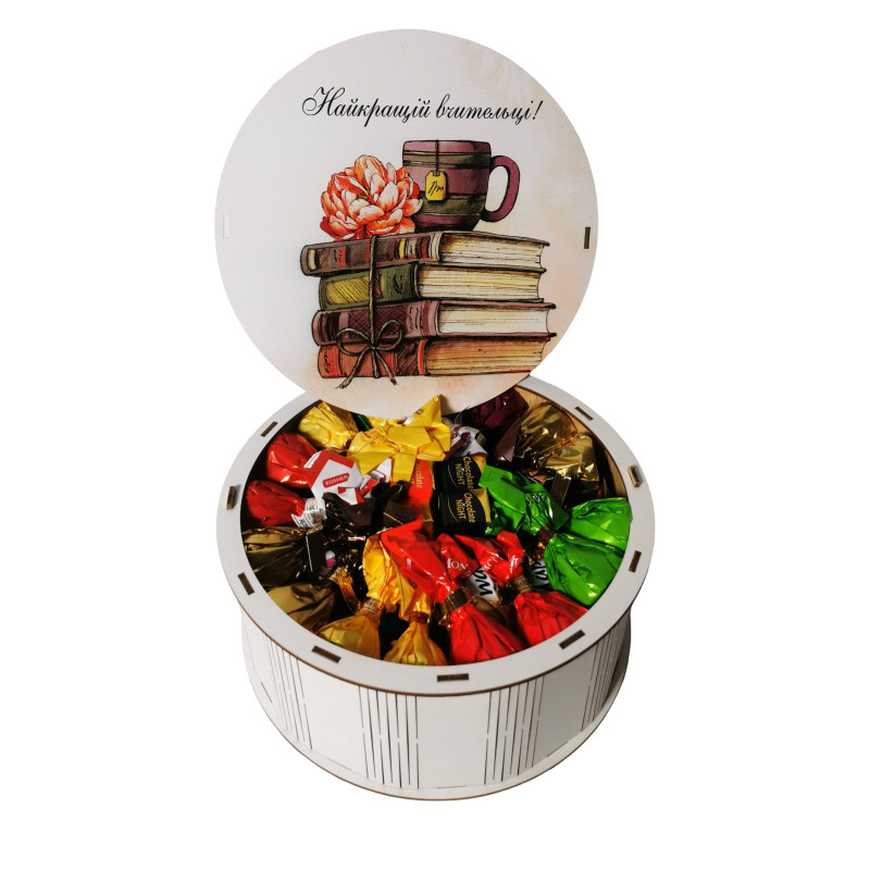 "Найкращій вчительці" Дерев’яний бокс з солодощами №101/73 , 1 кг, (21х21х9 см)