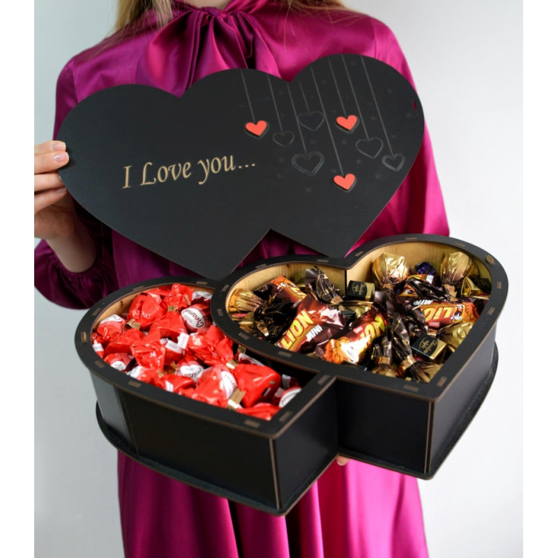Красивий смачний набір солодощів в дерев’яній коробці у формі подвійного серця. Чудовий подарунок на будь-яке свято для близьких та дорогих серцю людей, буде чудовим подарунком як для чоловіків, так і для жінок. Серед широкого асортименту смачних свіжих цукерок у наборі кожен зможе знайти собі солодощі до смаку.