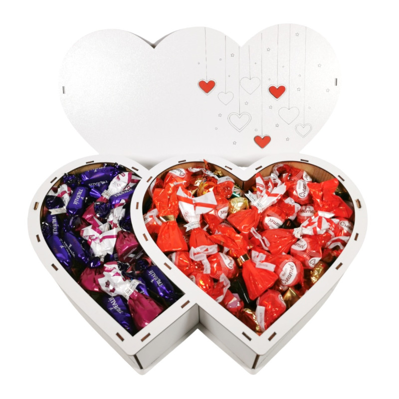 Красивий смачний набір солодощів в дерев’яній коробці у формі подвійного серця. Чудовий подарунок на будь-яке свято для близьких та дорогих серцю людей – мамі, донечці, сестрі, коханим, колезі по роботі, друзям. Серед широкого асортименту смачних свіжих цукерок кожен зможе знайти собі соkодощі до смаку.