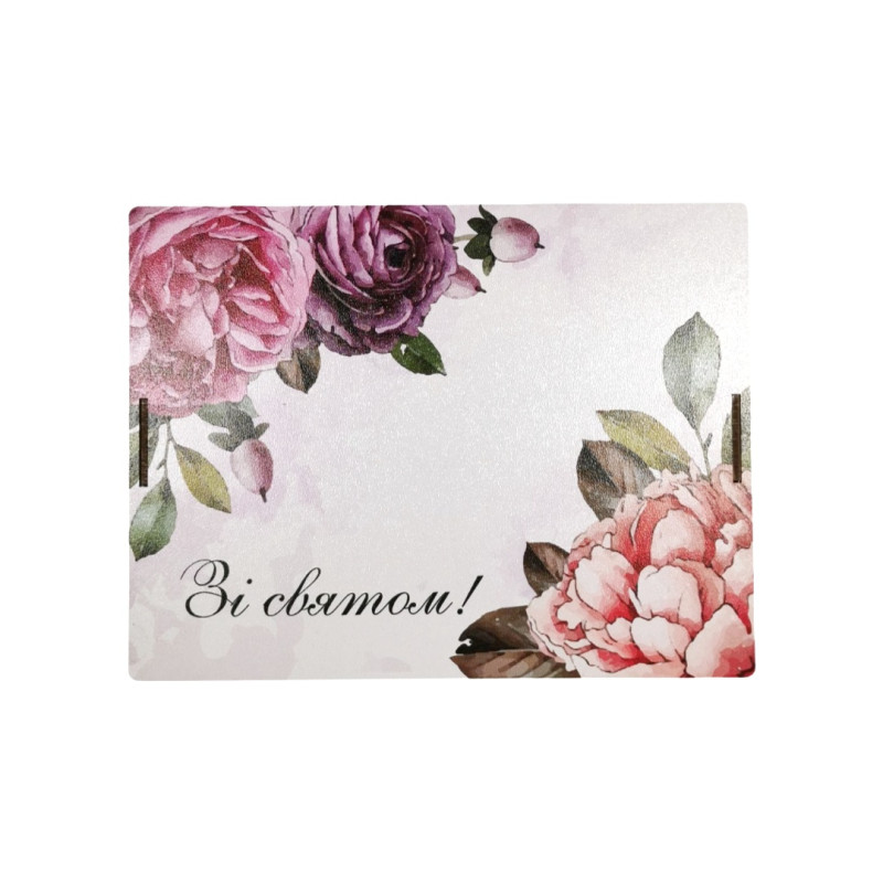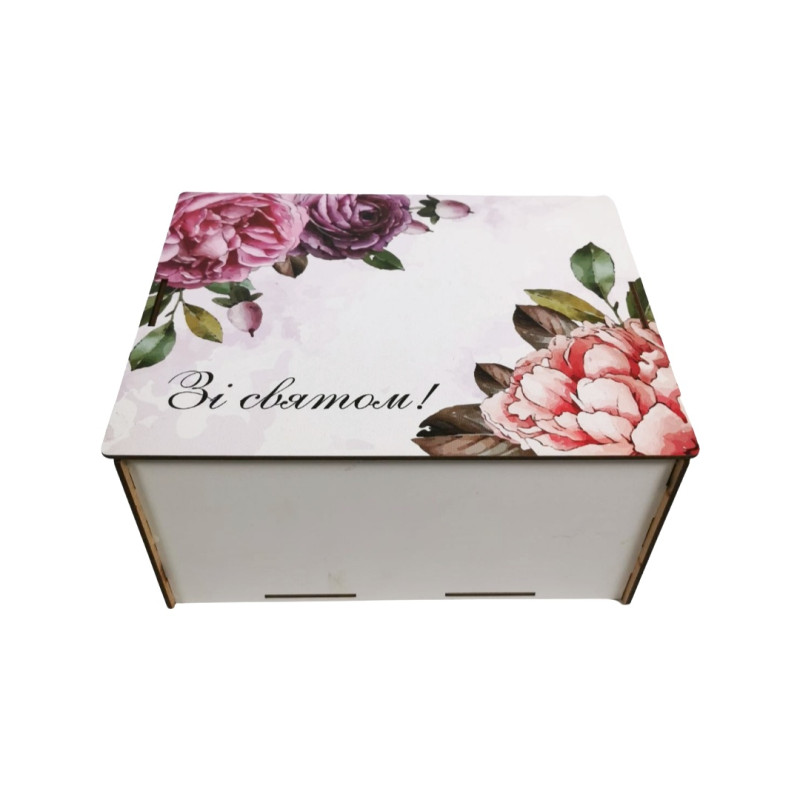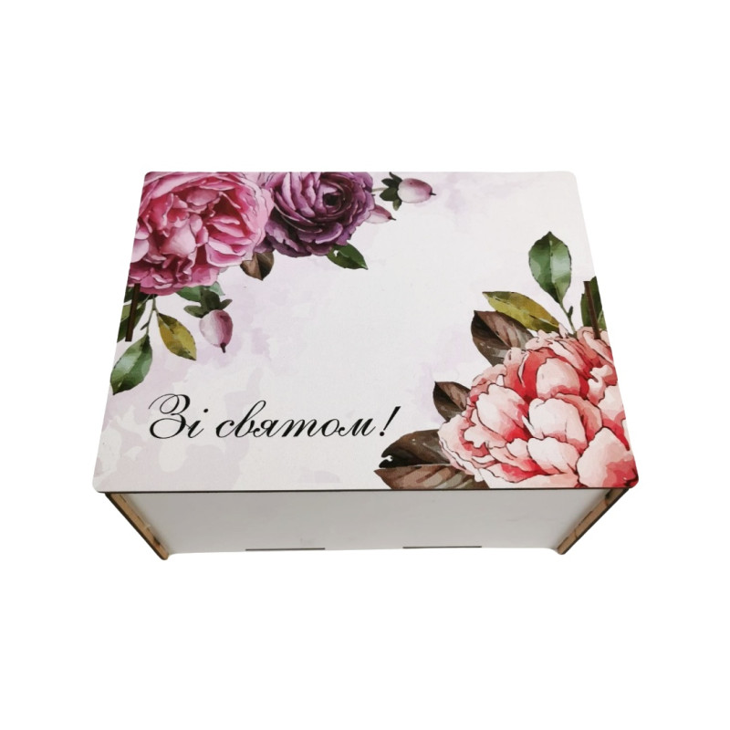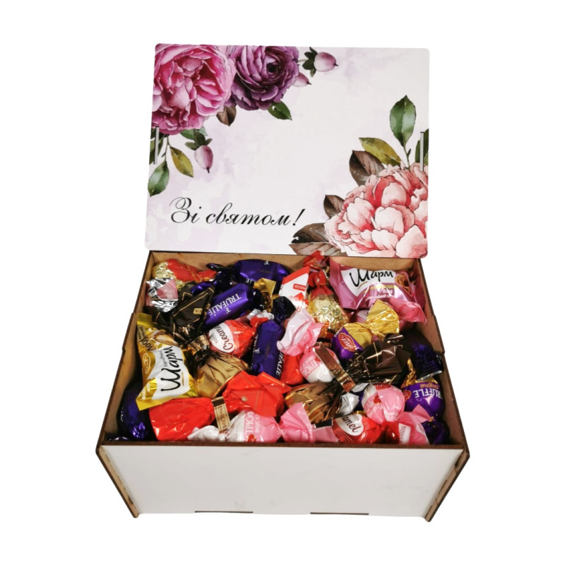 Подарунковий набір солодощів у дерев’яній коробці з квітковим принтом та написом «Зі святом".
