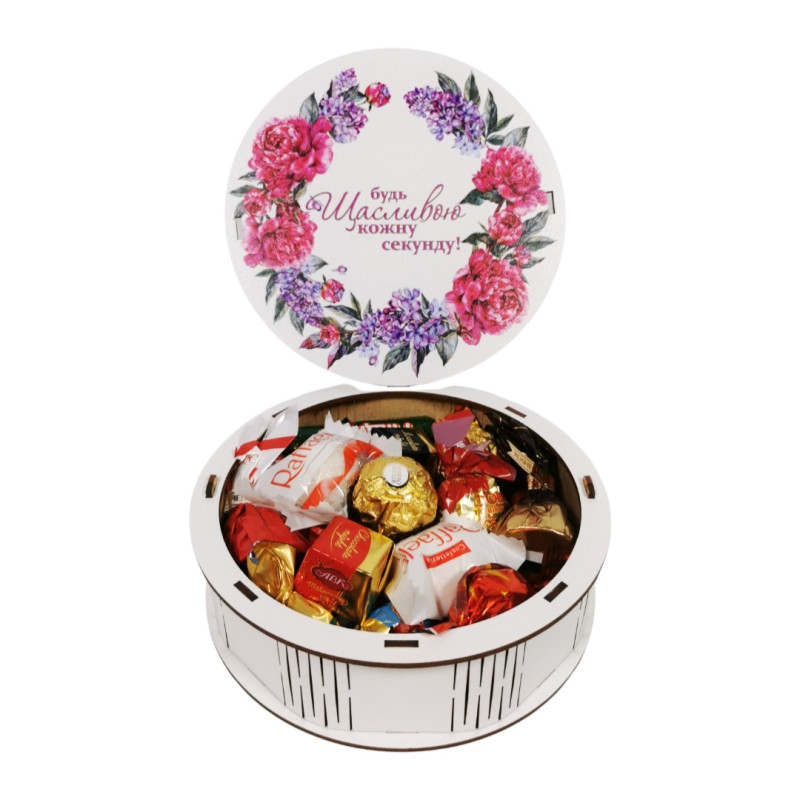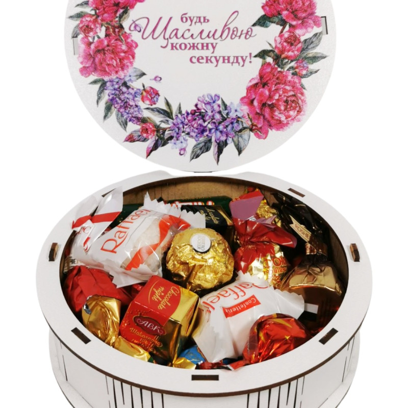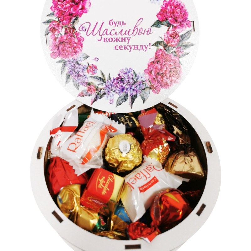 Чудовий солодкий подарунок для дівчини, жінки чи дитини прикрасить будь-яке свято – день народження, іменини, день матері, професійне свято. Широкий асортимент свіжих цукерок відомих виробників добавлять солодких барв до свята. Подарунковий набір солодощів у дерев’яній коробці за вигідною ціною.