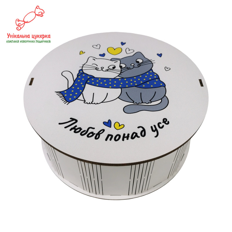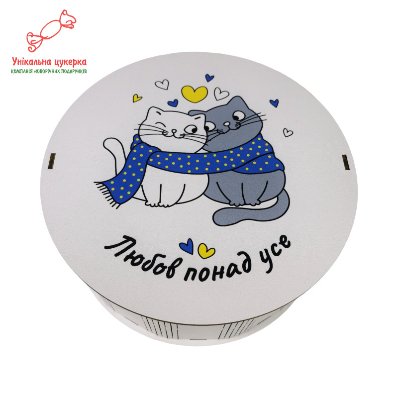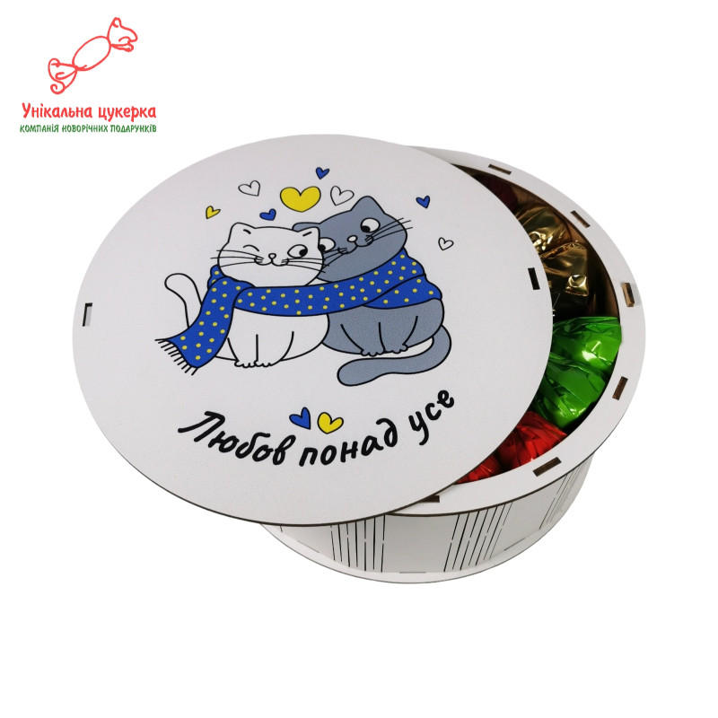 Чудовий подарунок на День закоханих та інші свята для коханої дружини чи чоловіка, для своїх половинок чи просто дорогих серцю людей. Підійде, щоб виразити найтепліші почуття і подарувати солодкі моменти радості своїм коханим. На коробці зображені милі стиньо-жові котята