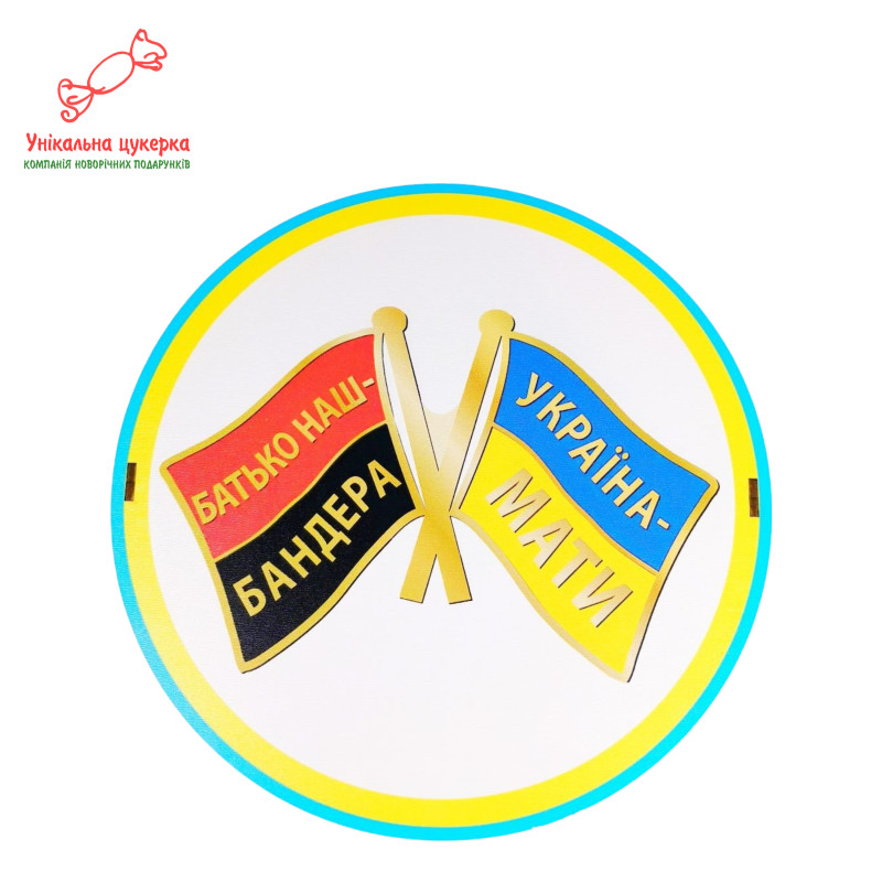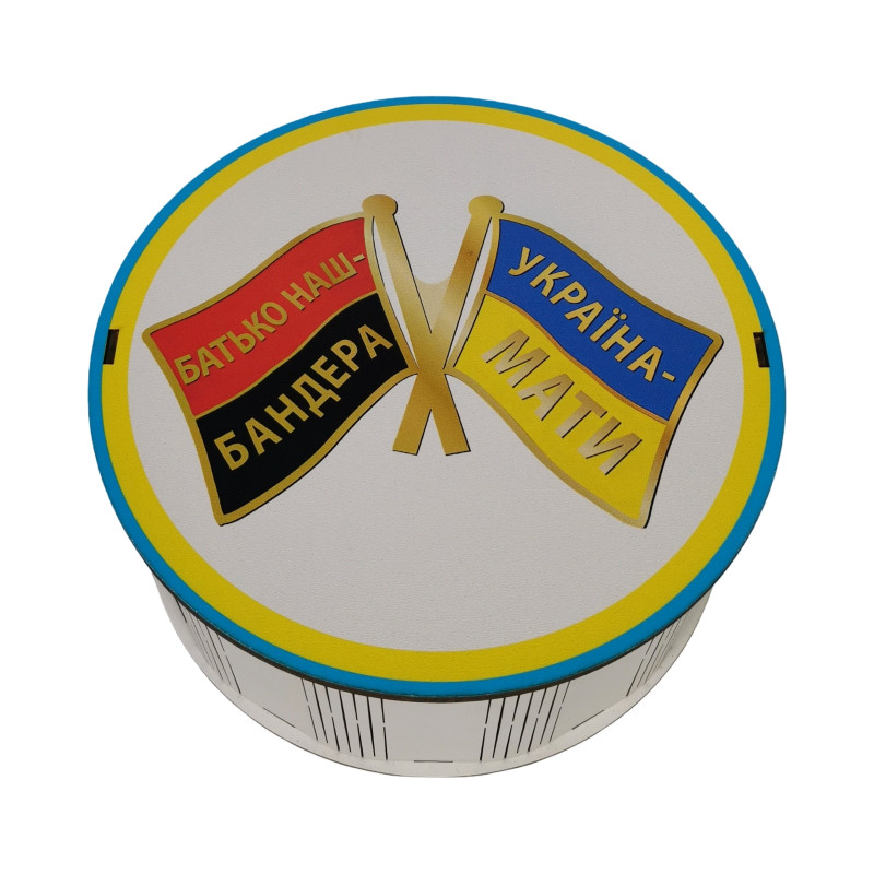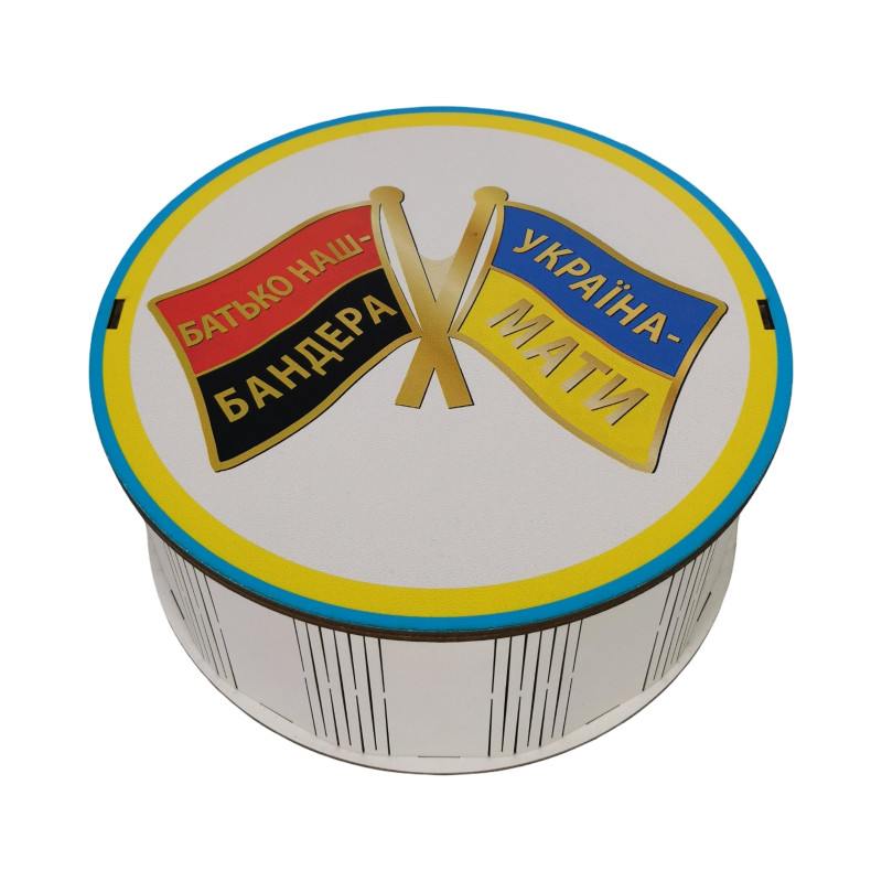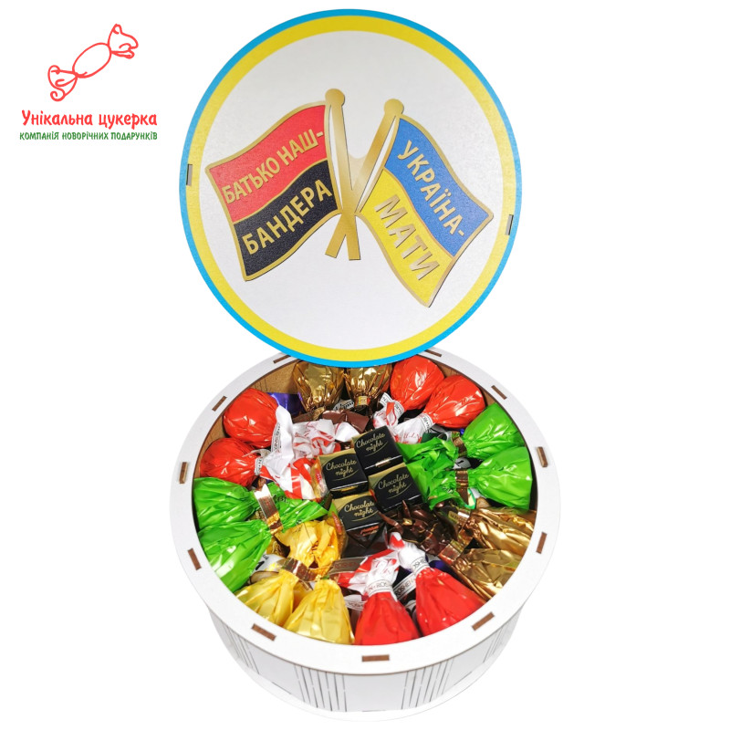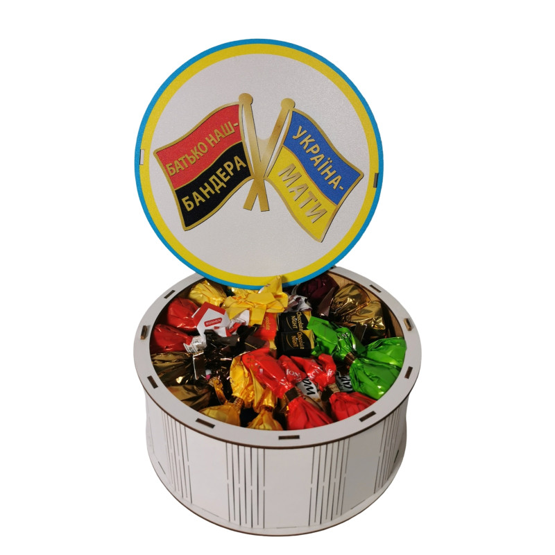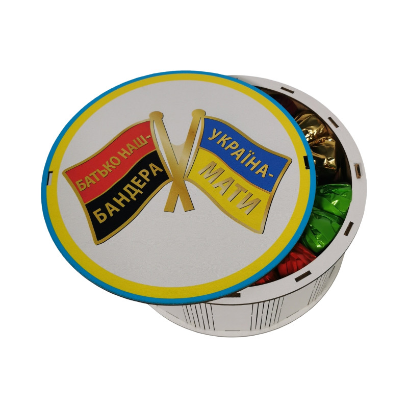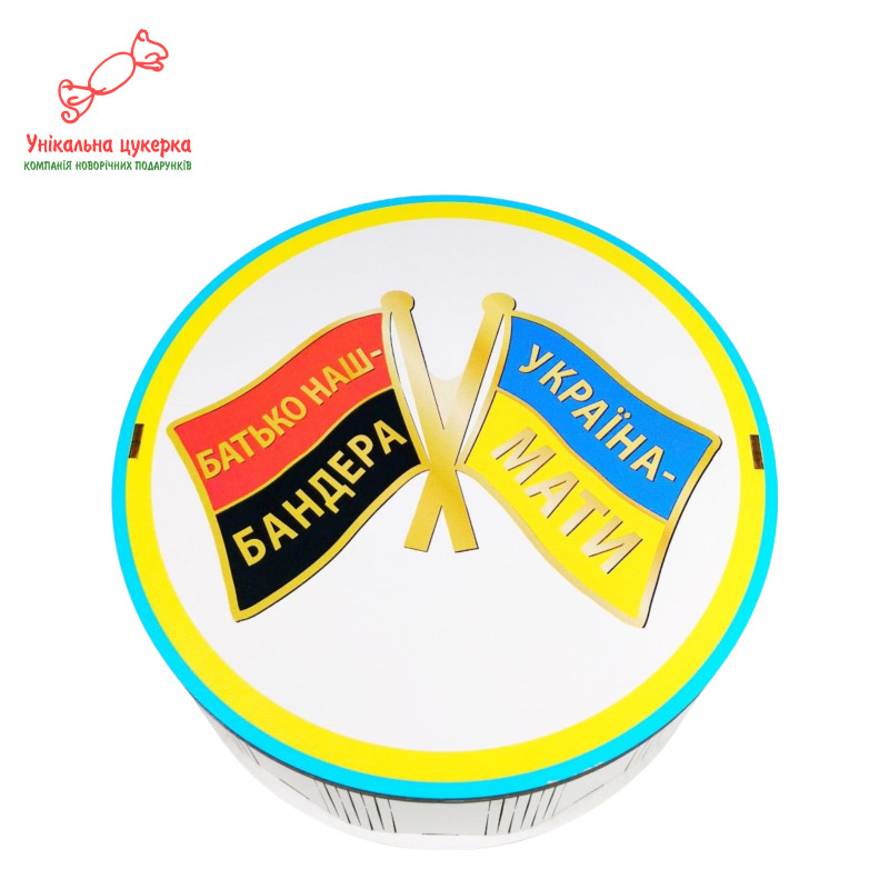 "Батько наш Бандера, Україна - мати!" Дерев'яний бокс з солодощами №101/36, 1 кг (21х21х9 см)