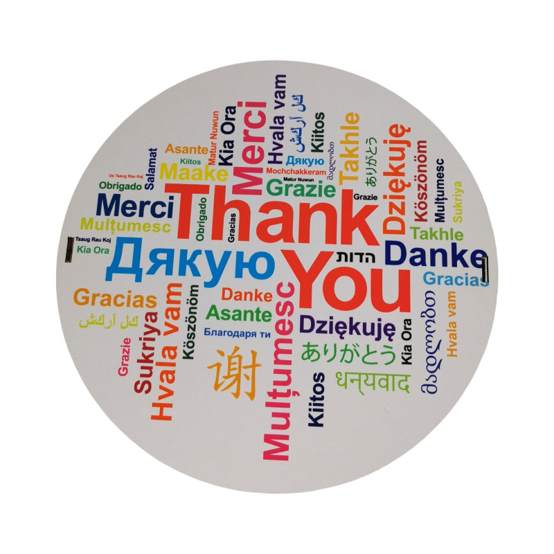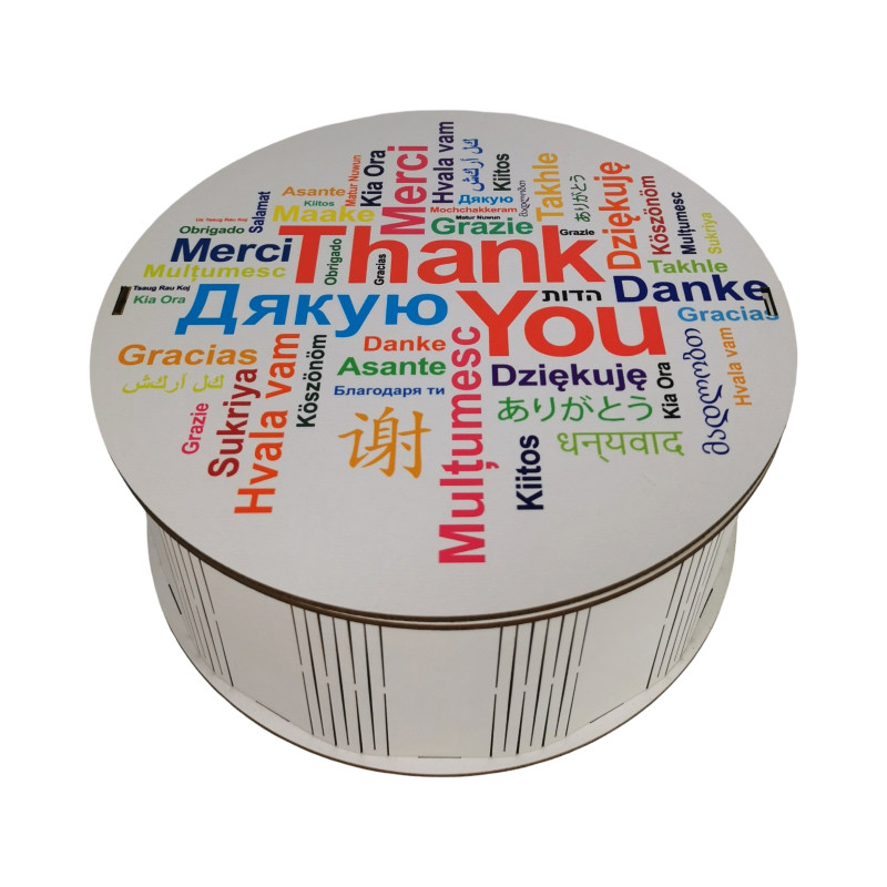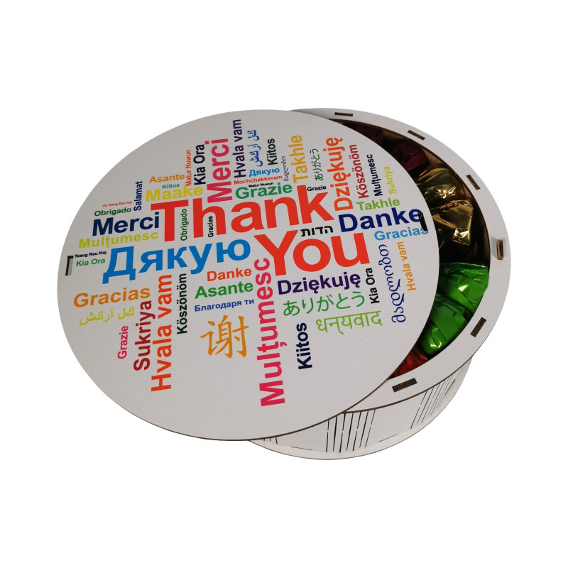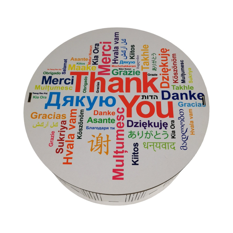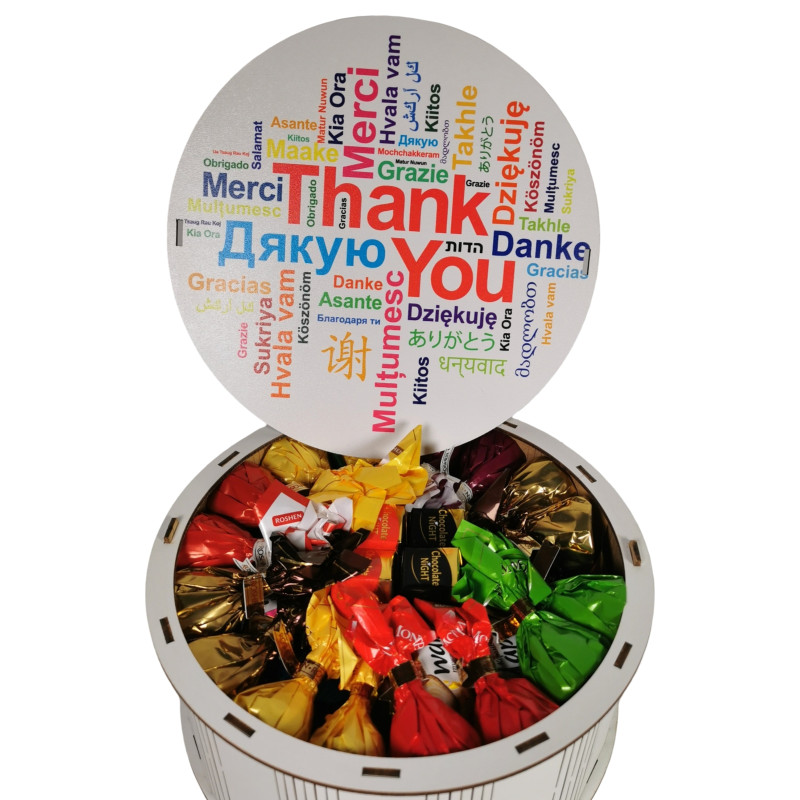 Фраза "Дякую" на коробці написана різними мовами світу