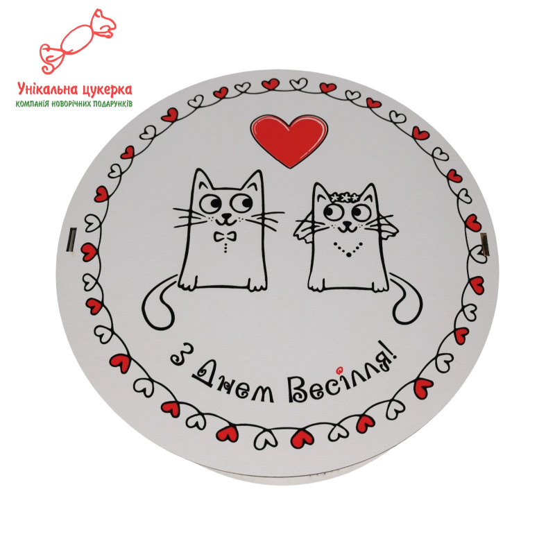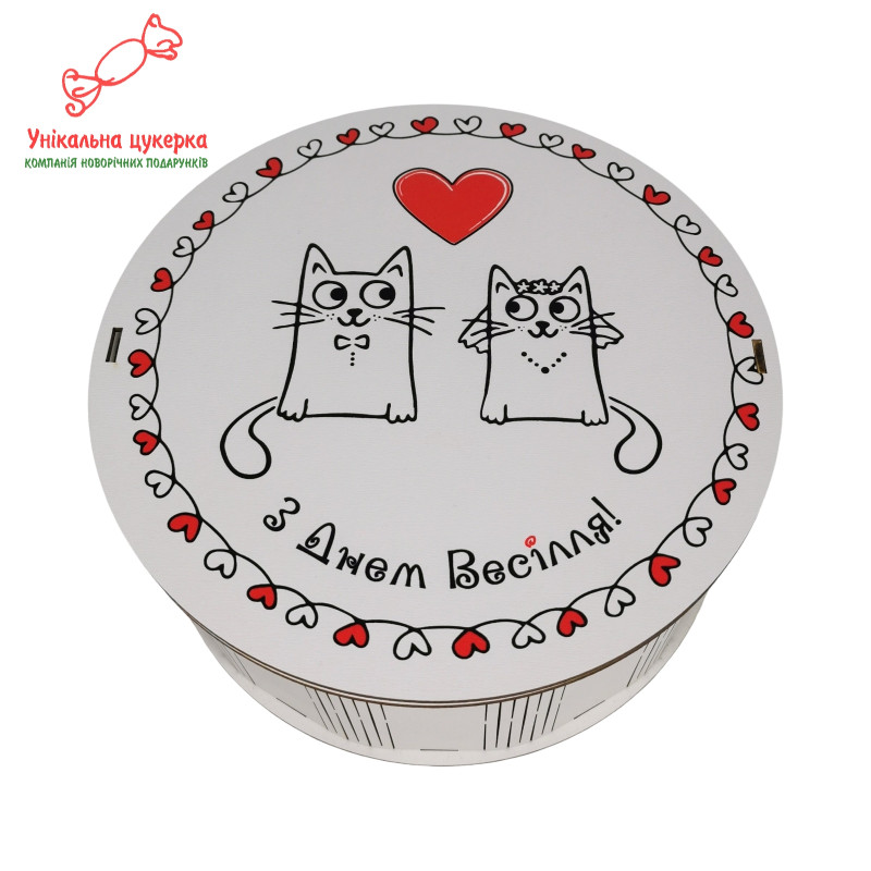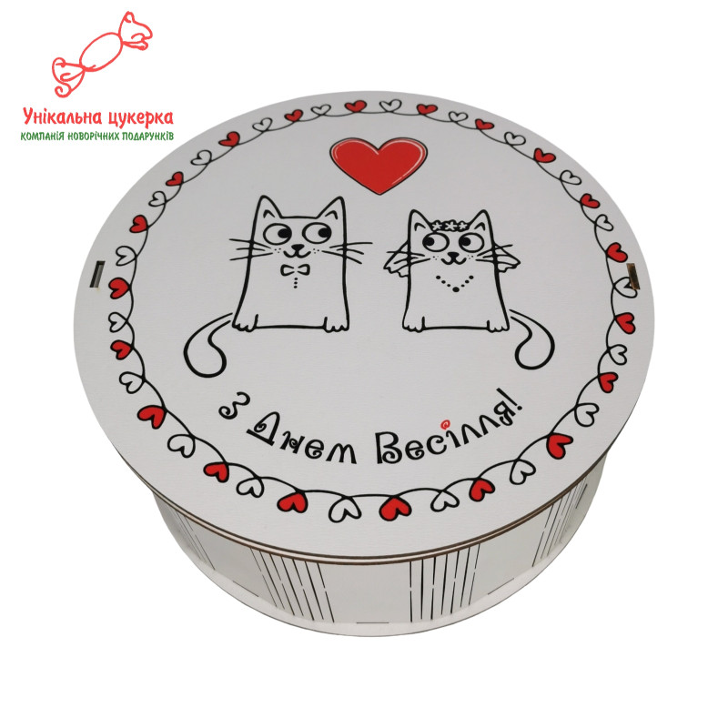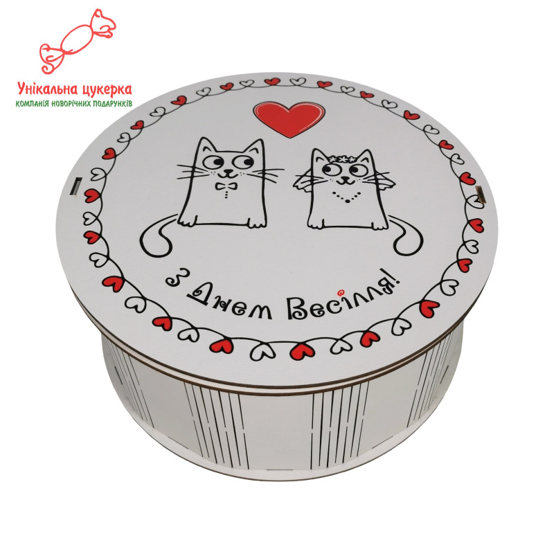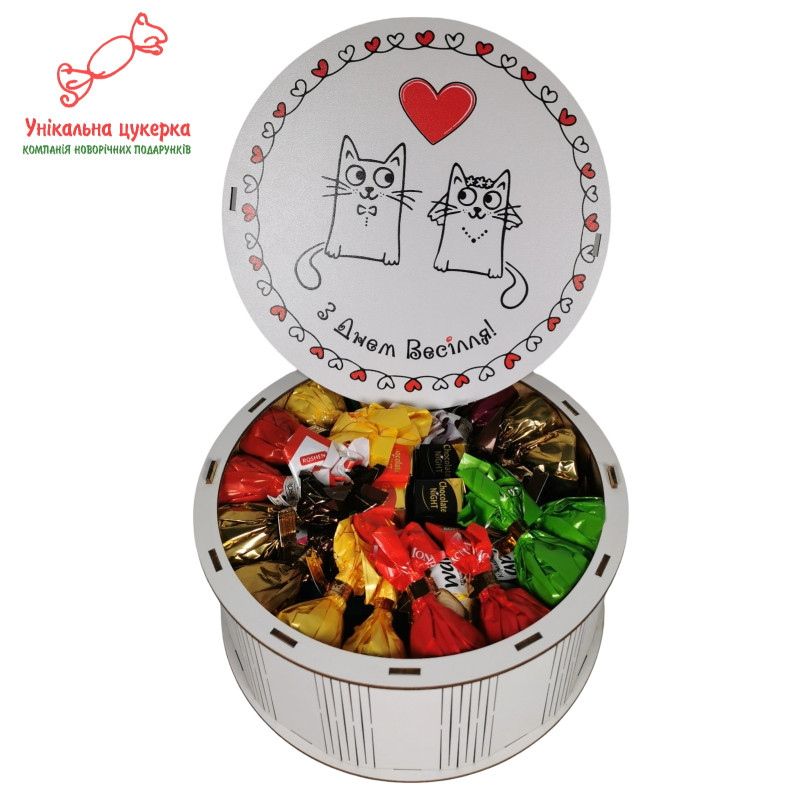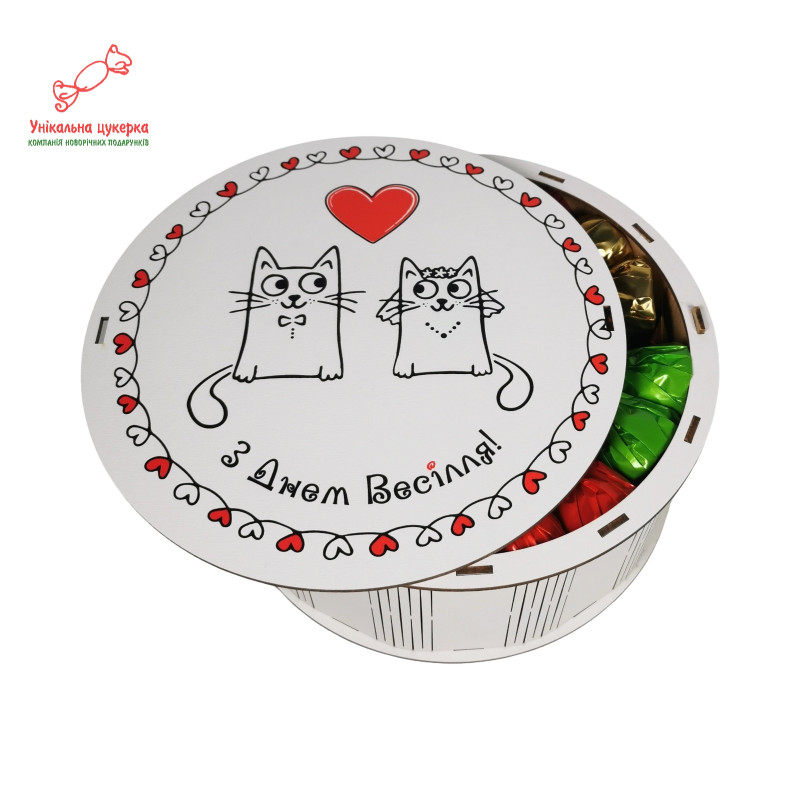 "З Днем весілля!" Дерев'яний бокс з солодощам №101/32, 1 кг (21х21х9 см)