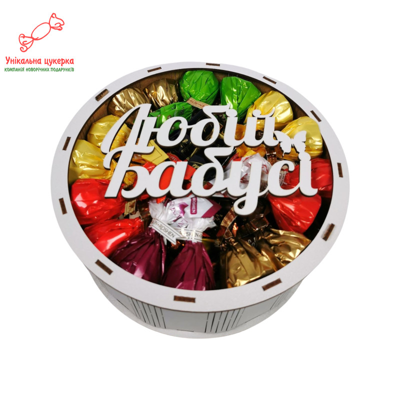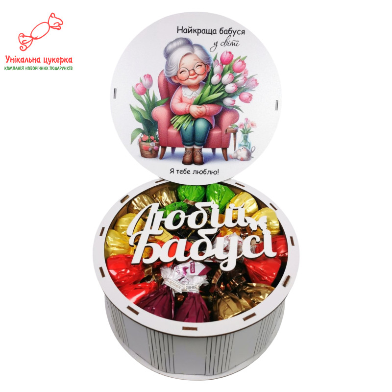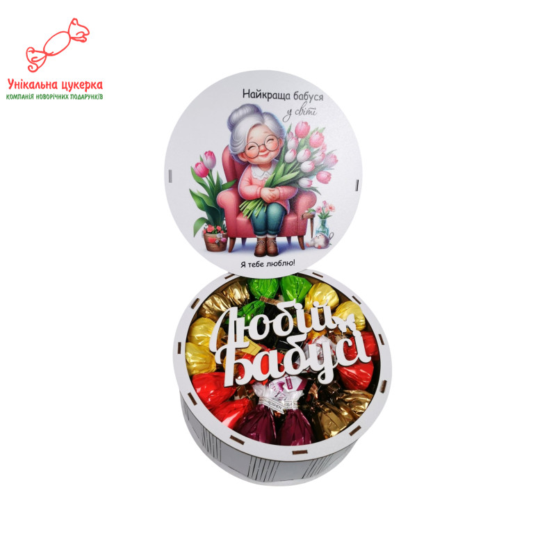 "Найкраща бабуся у світі" Дерев'яний бокс з солодощами №101/11, 1 кг (21х21х9 см)