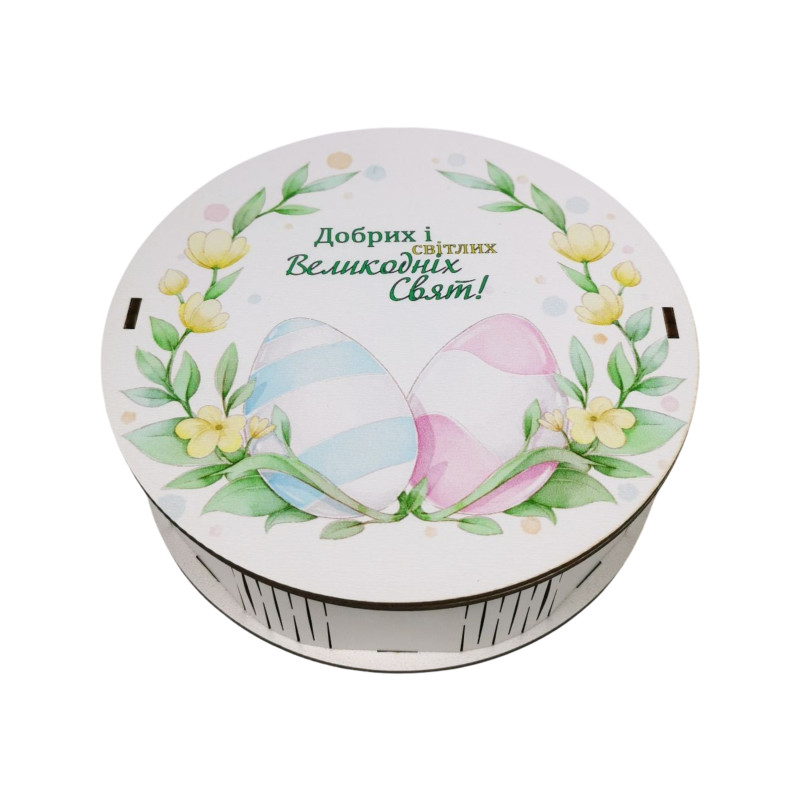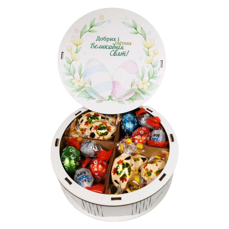 "Добрих і світлих Великодніх свят" Дерев'яний бокс з солодощами №278/4, (15х15х5 см)
