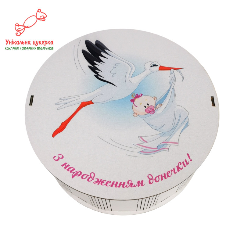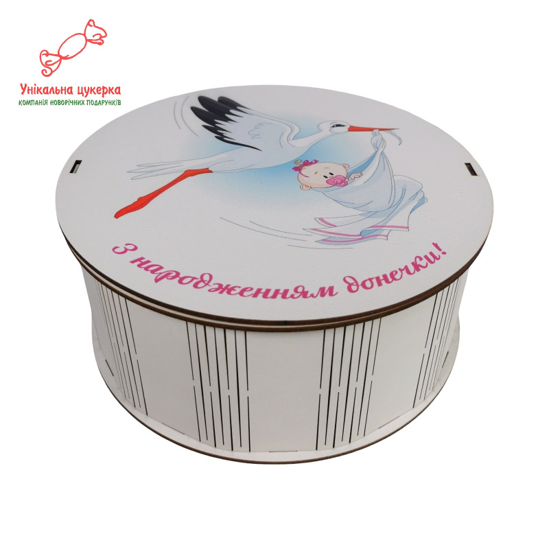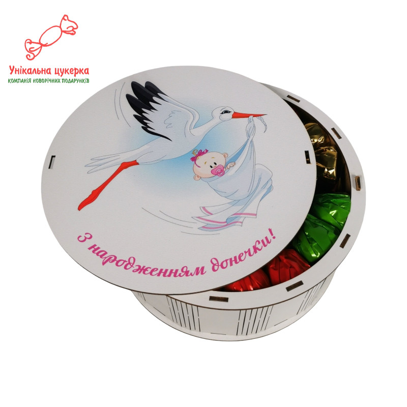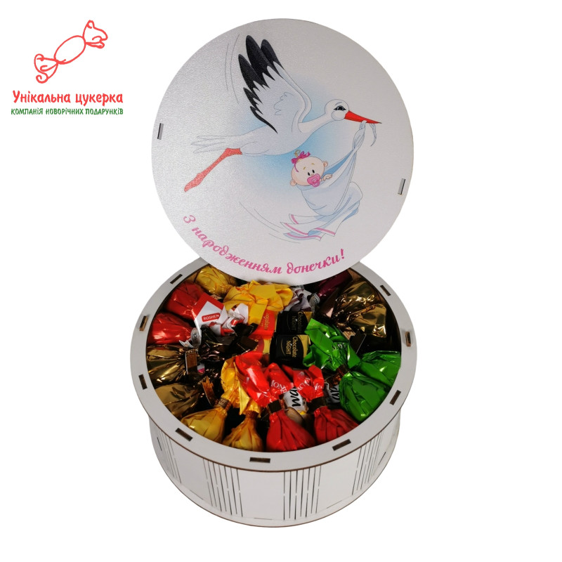 "З народженням донечки" Дерев'яний бокс з солодощами№101/30, 1 кг цукерок (21х21х9 см)