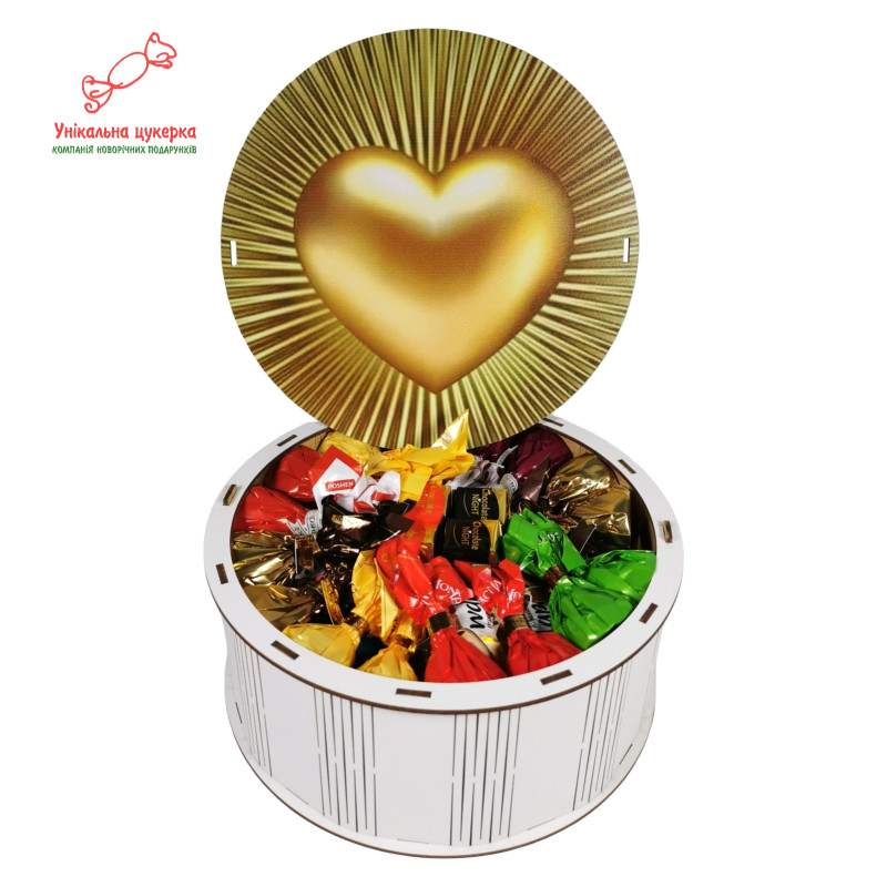 "Палаюче серце" Дерев'яний бокс з солодощами №101/26, 1 кг (21х21х9 см)