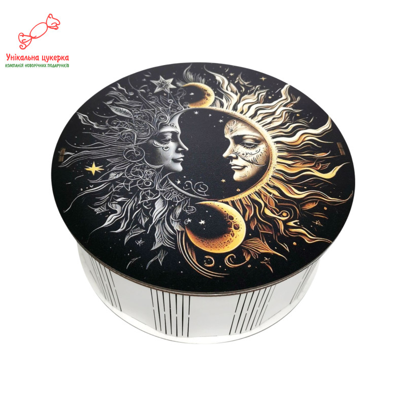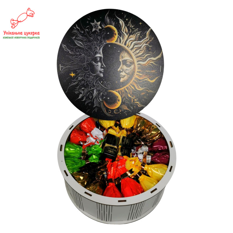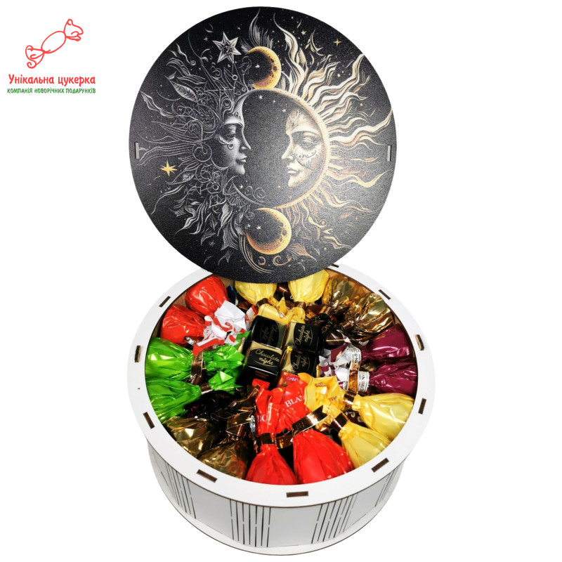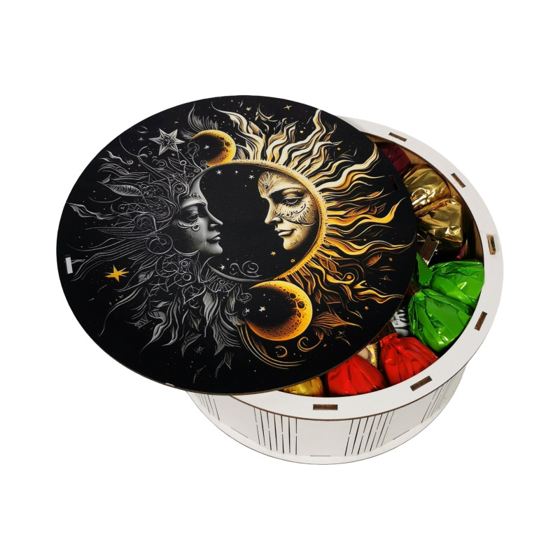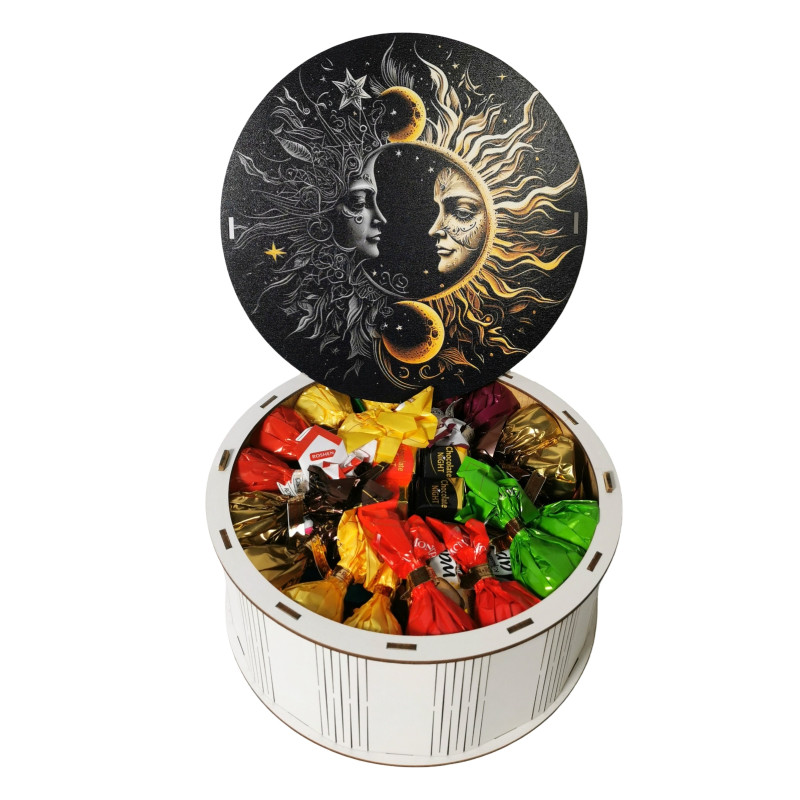 "День та ніч" Дерев'яний бокс з солодощами №101/17, 1 кг (21х21х9 см)