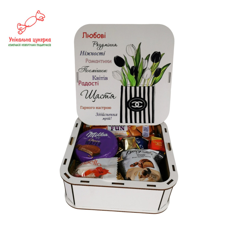 У випадку відсутності певної цукерки чи упаковки у виробника, у зв'язку з ситуацією в Україні, цукерка/упаковка буде замінена на рівноцінну по ціні, якості.