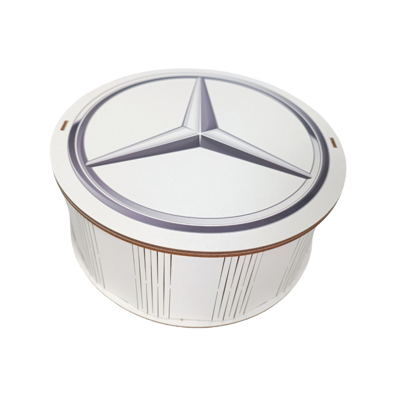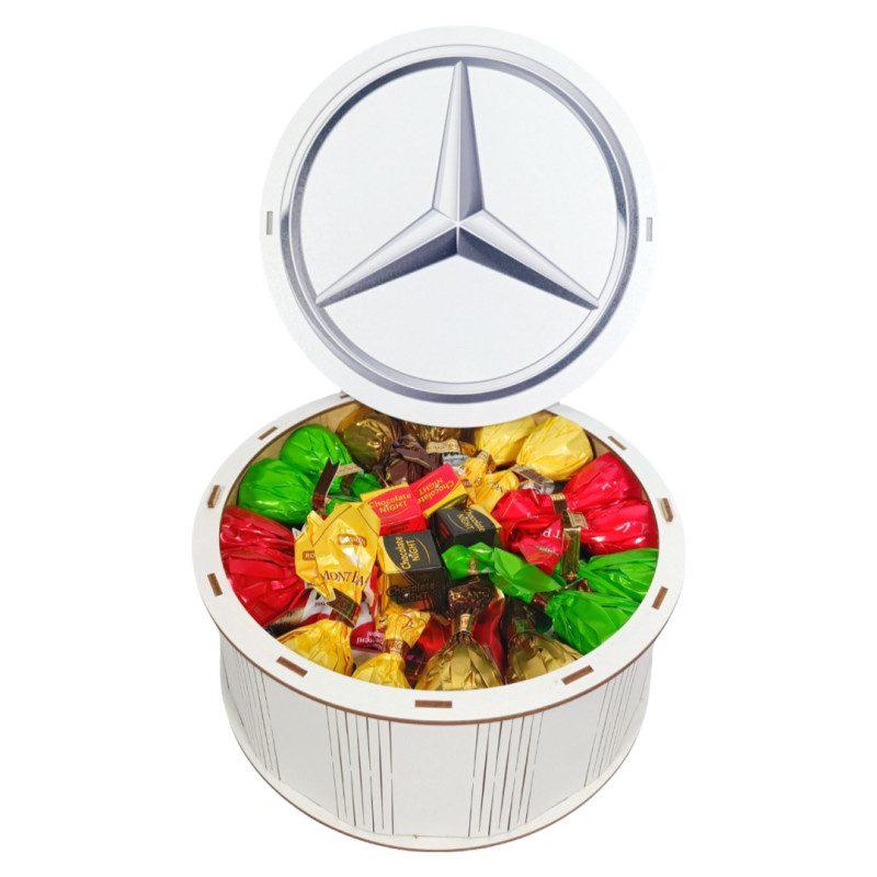 "Запаска справжнього автомобіліста Mersedes" Дерев'яний бокс з солодощами №101/19, 1 кг, (21х21х9см)