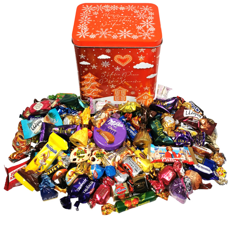 "Мон Блан з цілим лісовим горіхом" Рошен, "Мон Блан" з шоколадом і сезамом Рошен, "Червоний мак" Рошен, "Konafetto" Рошен, "Кара-Кум" Рошен, "Коко чоко White" Рошен, "Ліщина" Рошен, "Королівський шарм Мигдаль" АВК, "Королівський шарм Фундук" АВК, "Королівський шарм" АВК, "Труфальє" АВК, "Трюфель" АВК, "Шоколадна ніч" АВК, "Millennium Golden Nut" з ціл. горіхом, "Mone" чорний трюфель KONTI, "Золота лілія" KONTI, "Франческа" з цілим мигдалем ТМ Балу, "Диво Коконат" Аметист, "Курага з горіхом" Аметист, "Метеорит" Аметист, "Перлина Каракума" Аметист, "Прометей з родзинками" Аметист, "Чорнослив з горіхом" Аметист, "Krock" з арах. пастою Рошен, "Кенді нат карам.+арахіс" Рошен, "Пташине молоко" Бісквітка, "Belissimo" Classico KONTI, "Ромашка" Бісквітка, "Соренто" Рошен, "Mr.BIGuin" АВК, "Чарівна казка" Бісквітка, "Білочка" Golski, "Паратруфель горіх" Golski, "Паратруфель" Golski, "Coffee Art" Golski, "Шервуд" Golski, "Stella" Бісквітка, "Ажіотаж" Бісквітка, "Кремлате" Бісквітка, "Ля крема" Бісквітка, "Ніколь крем брюле" Бісквітка, "Ніколь" Бісквітка, "Паризька весна" Бісквітка, "Ранкова зірка" Бісквітка, "Реноме" Бісквітка, "Galaretka" Рошен, "Желейка цитрус" Бісквітка, "Johnny Krocker" Рошен, "Гулівер" міні вафля АВК, "Несквік" Нестле, "Choco Wafer" Міlkа 30 г.