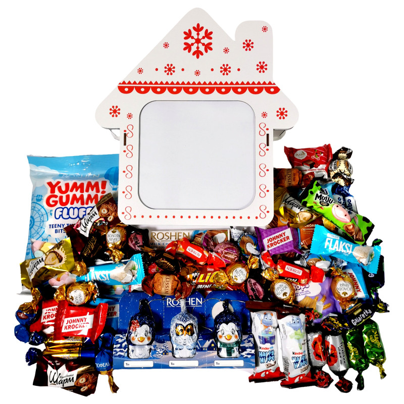 "Червоний мак" Рошен, "Королівський шарм Фундук" АВК, "Королівський шарм" АВК, "Трюфель" АВК, "Золота лілія" KONTI, "Пташка мармелашка" ТМ ЖАКО, "Диво Коконат" Аметист, "Перлина Каракума" Аметист, "Кенді нат карам.+арахіс" Рошен, "Flaksi coconut" Рошен, "Хто сказав МУ?" міні АВК, "Belissimo" Classico KONTI, "Чарівна казка" Бісквітка, "Coco Jumbo" Golski, "Кремлате" Бісквітка, "Ніколь" Бісквітка, "Чоко крем" Бісквітка, "Galaretka" Рошен, "Johnny Krocker" coconut Рошен, "Johnny Krocker" Рошен, "Roshetto" вафля Рошен, "Crispy-knops" вафля Polus, "Батон" помадно-шоколадний Рошен, "Toffelini" Рошен, "Лайон" Нестле, "Kinder Happy Hippo" 20,7 г, "Бісквіт БАРНІ" 30 г, Маршмеллоу "Yummi Gummi" Bits Рошен, Шоколадна фігурка "Зимові друзі" 60 г Рошен.