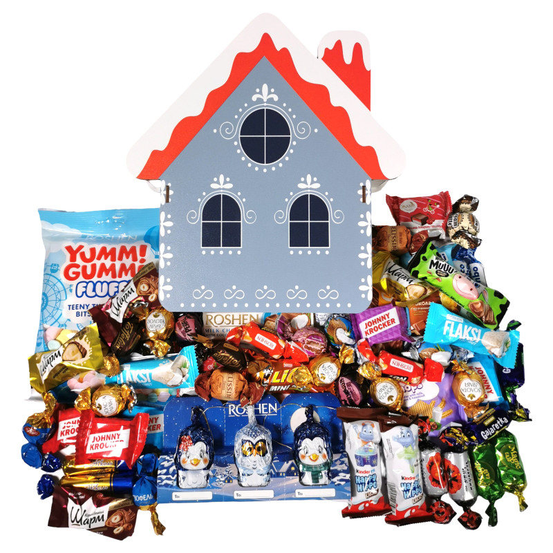 "Червоний мак" Рошен, "Королівський шарм Фундук" АВК, "Королівський шарм" АВК, "Трюфель" АВК, "Золота лілія" KONTI, "Пташка мармелашка" ТМ ЖАКО, "Диво Коконат" Аметист, "Перлина Каракума" Аметист, "Кенді нат карам.+арахіс" Рошен, "Flaksi coconut" Рошен, "Хто сказав МУ?" міні АВК, "Belissimo" Classico KONTI, "Чарівна казка" Бісквітка, "Coco Jumbo" Golski, "Кремлате" Бісквітка, "Ніколь" Бісквітка, "Чоко крем" Бісквітка, "Galaretka" Рошен, "Johnny Krocker" coconut Рошен, "Johnny Krocker" Рошен, "Roshetto" вафля Рошен, "Crispy-knops" вафля Polus, "Батон" помадно-шоколадний Рошен, "Toffelini" Рошен, "Лайон" Нестле, "Kinder Happy Hippo" 20,7 г, "Бісквіт БАРНІ" 30 г, Маршмеллоу "Yummi Gummi" Bits Рошен, Шоколадна фігурка "Зимові друзі" 60 г Рошен.