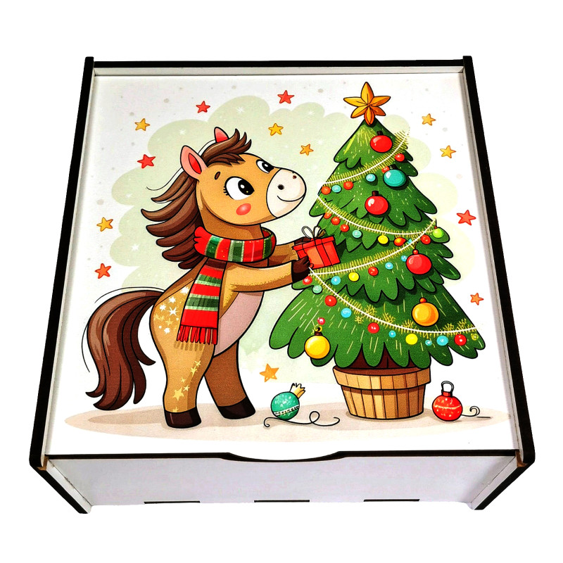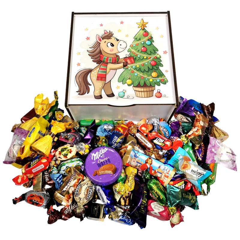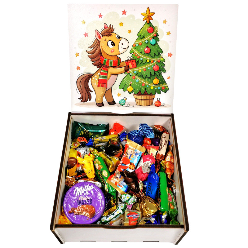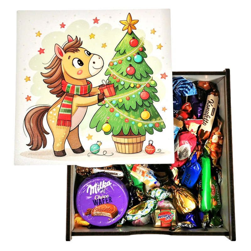 Подарунок №38/1 “Коник та ялинка” 1кг (20х20х9см, у дерев'яній коробці)