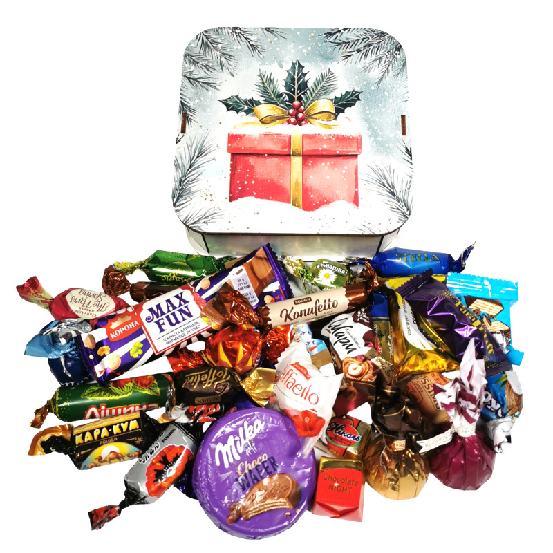 "Мон Блан з цілим лісовим горіхом" Рошен, "Мон Блан" з подр. мигдалем Рошен, "Червоний мак" Рошен, "Konafetto" Рошен, "Кара-Кум" Рошен, "Ліщина" Рошен, "Королівський шарм Фундук" АВК, "Труфальє" АВК, "Шоколадна ніч" молочна АВК, "Диво Коконат" Аметист, "Прометей з родзинками" Аметист, "Пташине молоко" зі смаком лимону Бісквітка, "Belissimo" Classico KONTI, "Ромашка" Бісквітка, "Чарівна казка" Бісквітка, "Паратруфель" Golski, "Stella" Бісквітка, "Ля крема" Бісквітка, "Ніколь крем брюле" Бісквітка, "Ніколь" Бісквітка, "Паризька весна" Бісквітка, "Johnny Krocker" coconut Рошен, "Гулівер" міні вафля АВК, "Toffelini" Рошен, "Raffaello", "Choco Wafer" Міlkа 30 г, "MAX FUN" батончик Корона 38 г.