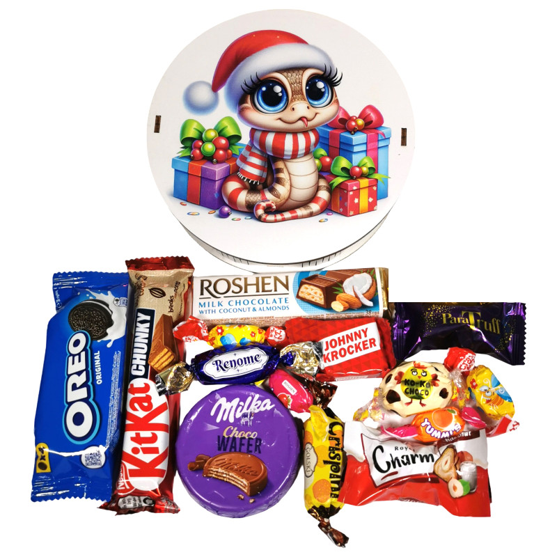 "Коко чоко White" Рошен, "Royal Charm фундук" АВК, "Паратруфель" Golski, "Crispini" Golski, "Реноме" Бісквітка, "Johnny Krocker" Рошен, "Батон" помадно-шоколадний Рошен, "Yummi's" тоффі Рошен, "Шалена бджілка" Рошен, "КІТКАТ chunky" мол. Нестле, "Choco Wafer" Міlkа 30 г, "Печиво OREO" 38 г.