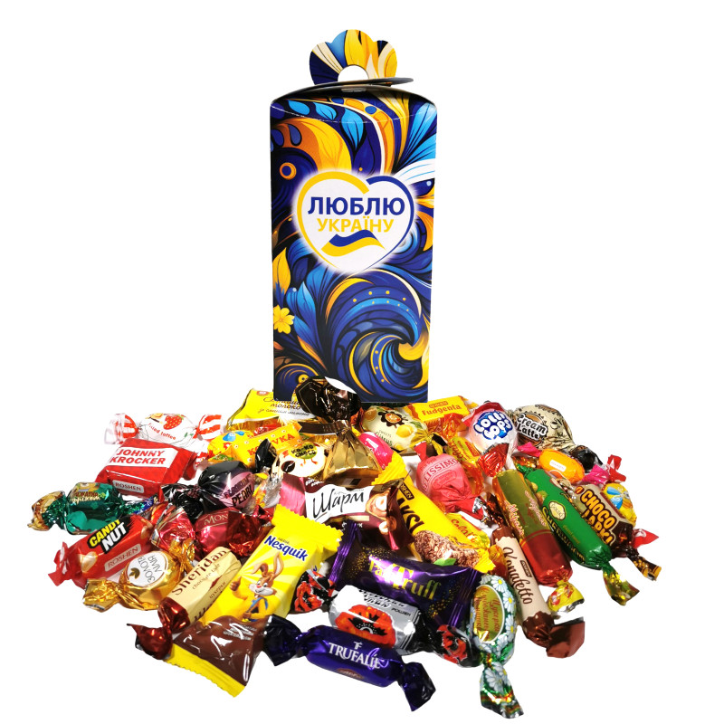 "Мон Блан з цілим лісовим горіхом" Рошен, "Червоний мак" Рошен, "Королівський шарм Фундук" АВК, "Труфальє" АВК, "Konafetto" Рошен, "Коко чоко White" Рошен, "Mone" чорний трюфель KONTI, "Золота лілія" KONTI, "Перлина Каракума" Аметист, "Кенді нат карам.+арахіс" Рошен, "Пташине молоко" зі смаком лимону Бісквітка, "Flaksi cocoa" Рошен, "Belissimo" полуниця з вершками KONTI, "Ромашка" Бісквітка, "Шерідан" АВК, "Ведмежатко" з горіхом KONTI, "Паратруфель" Golski, "Шервуд" Golski, "Кремлате" Бісквітка, "Мірель" Бісквітка, "Желейка цитрус" Бісквітка, "Johnny Krocker" Рошен, "Minky-Binky" Рошен, "Yummi's" тоффі Рошен, "Еклер" Рошен, "Корівка" Рошен, "Лоллі попс" Рошен, "Фуджента" ірис Рошен, "Шалена бджілка" Рошен, "Шоколапки ВФ" Рошен, "Несквік" Нестле.