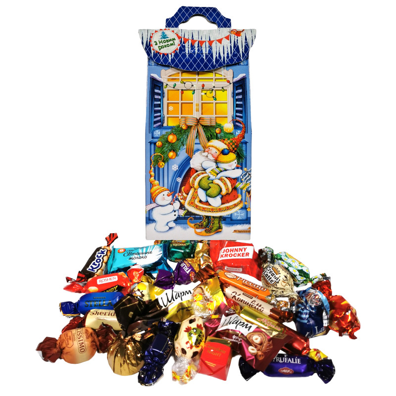 "Мон Блан з цілим лісовим горіхом" Рошен, "Королівський шарм Фундук" АВК, "Королівський шарм" АВК, "Труфальє" АВК, "Трюфель" АВК, "Шоколадна ніч" молочна АВК, "Konafetto" Рошен, "Коко чоко White" Рошен, "Mone" молочний трюфель KONTI, "Прометей з родзинками" Аметист, "Krock" з арах. пастою Рошен, "Кенді нат карам.+арахіс" Рошен, "Пташине молоко" Бісквітка, "Belissimo" Classico KONTI, "Ромашка" Бісквітка, "Шерідан" АВК, "Ведмежатко" з горіхом KONTI, "Piccolo" Golski, "Stella" Бісквітка, "Кремлате" Бісквітка, "Ля крема" Бісквітка, "Мірель" Бісквітка, "Желейка цитрус" Бісквітка, "Johnny Krocker" Рошен.