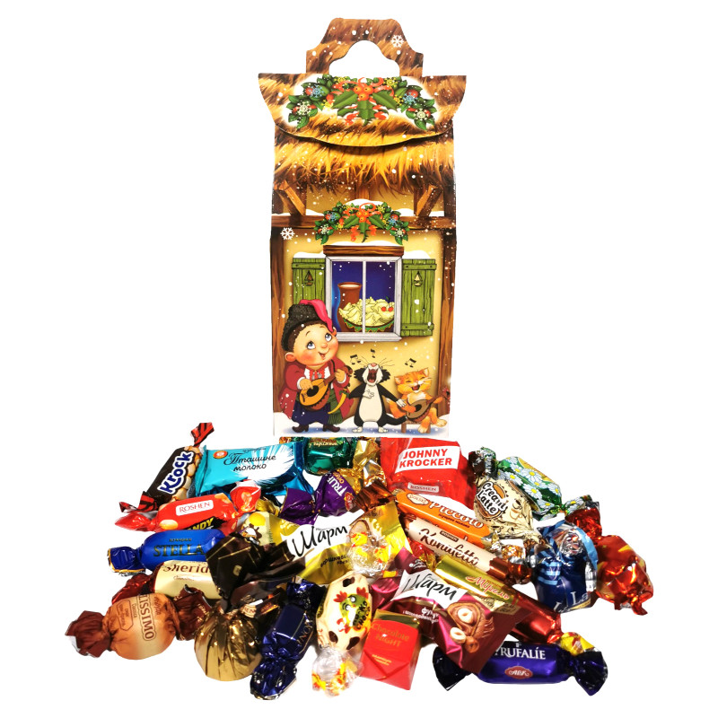 "Мон Блан з цілим лісовим горіхом" Рошен, "Королівський шарм Фундук" АВК, "Королівський шарм" АВК, "Труфальє" АВК, "Трюфель" АВК, "Шоколадна ніч" молочна АВК, "Konafetto" Рошен, "Коко чоко White" Рошен, "Mone" молочний трюфель KONTI, "Прометей з родзинками" Аметист, "Krock" з арах. пастою Рошен, "Кенді нат карам.+арахіс" Рошен, "Пташине молоко" Бісквітка, "Belissimo" Classico KONTI, "Ромашка" Бісквітка, "Шерідан" АВК, "Ведмежатко" з горіхом KONTI, "Piccolo" Golski, "Stella" Бісквітка, "Кремлате" Бісквітка, "Ля крема" Бісквітка, "Мірель" Бісквітка, "Желейка цитрус" Бісквітка, "Johnny Krocker" Рошен.