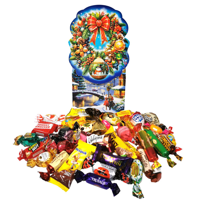 "Мон Блан з цілим лісовим горіхом" Рошен, "Червоний мак" Рошен, "Королівський шарм Фундук" АВК, "Труфальє" АВК, "Konafetto" Рошен, "Коко чоко White" Рошен, "Mone" чорний трюфель KONTI, "Золота лілія" KONTI, "Перлина Каракума" Аметист, "Кенді нат карам.+арахіс" Рошен, "Пташине молоко" зі смаком лимону Бісквітка, "Flaksi cocoa" Рошен, "Belissimo" полуниця з вершками KONTI, "Ромашка" Бісквітка, "Шерідан" АВК, "Ведмежатко" з горіхом KONTI, "Паратруфель" Golski, "Шервуд" Golski, "Кремлате" Бісквітка, "Мірель" Бісквітка, "Желейка цитрус" Бісквітка, "Johnny Krocker" Рошен, "Minky-Binky" Рошен, "Yummi's" тоффі Рошен, "Еклер" Рошен, "Корівка" Рошен, "Лоллі попс" Рошен, "Фуджента" ірис Рошен, "Шалена бджілка" Рошен, "Шоколапки ВФ" Рошен, "Несквік" Нестле.