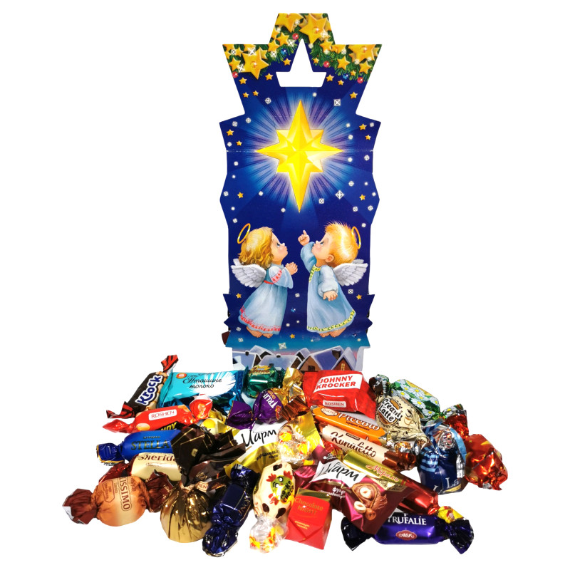 "Мон Блан з цілим лісовим горіхом" Рошен, "Королівський шарм Фундук" АВК, "Королівський шарм" АВК, "Труфальє" АВК, "Трюфель" АВК, "Шоколадна ніч" молочна АВК, "Konafetto" Рошен, "Коко чоко White" Рошен, "Mone" молочний трюфель KONTI, "Прометей з родзинками" Аметист, "Krock" з арах. пастою Рошен, "Кенді нат карам.+арахіс" Рошен, "Пташине молоко" Бісквітка, "Belissimo" Classico KONTI, "Ромашка" Бісквітка, "Шерідан" АВК, "Ведмежатко" з горіхом KONTI, "Piccolo" Golski, "Stella" Бісквітка, "Кремлате" Бісквітка, "Ля крема" Бісквітка, "Мірель" Бісквітка, "Желейка цитрус" Бісквітка, "Johnny Krocker" Рошен.