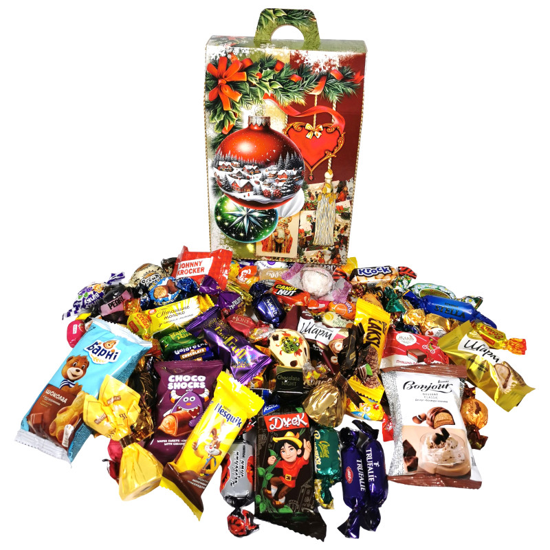 "Мон Блан з цілим лісовим горіхом" Рошен, "Мон Блан" з шоколадом і сезамом Рошен, "Червоний мак" Рошен, "Королівський шарм Фундук" АВК, "Королівський шарм" АВК, "Труфальє" АВК, "Трюфель" АВК, "Шоколадна ніч" АВК, "Mone" молочний трюфель KONTI, "Konafetto" Рошен, "Коко чоко White" Рошен, "Mone" чорний трюфель KONTI, "Золота лілія" KONTI, "Пташка мармелашка" ТМ ЖАКО, "Франческа" з цілим мигдалем ТМ Балу, "Ромашка" Світоч, "Метеорит" Аметист, "Перлина Каракума" Аметист, "Krock" з арах. пастою Рошен, "Кенді нат карам.+арахіс" Рошен, "Пташине молоко" зі смаком лимону Бісквітка, "Flaksi cocoa" Рошен, "Belissimo" полуниця з вершками KONTI, "Ромашка" Бісквітка, "Шерідан" АВК, "Чарівна казка" Бісквітка, "Ведмежатко" з горіхом KONTI, "Паратруфель" Golski, "Шервуд" Golski, "Stella" Бісквітка, "Кремлате" Бісквітка, "Мірель" Бісквітка, "Galaretka" Рошен, "Желейка цитрус" Бісквітка, "Johnny Krocker" Рошен, "Джек" вафля KONTI, "Choco Shocks" вафля Polus, "CoffeLike" Рошен, "Minky-Binky" Рошен, "Toffelini" Рошен, "Yummi's" тоффі Рошен, "Джеллі" Рошен, "Еклер" Рошен, "Карамель" молочна Бісквітка, "Корівка" Рошен, "Лоллі попс" Рошен, "Фуджента" ірис Рошен, "Шалена бджілка" Рошен, "Шоколапки ВФ" Рошен, "Несквік" Нестле, "Bonjour" KONTI 29 г, "Бісквіт БАРНІ" 30 г.